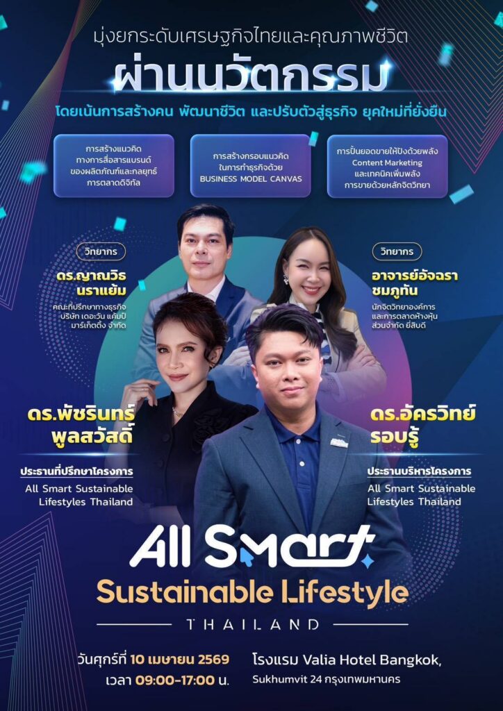 โครงการ All Smart Sustainable Lifestyle นำโดย ดร.อัครวิทย์ รอบรู้ ประธานบริหารโครงการ พร้อมด้วย นายชารีฟ อิทธิฤทธิ์ กรรมการผู้จัดการ พร้อมด้วย ดร.พัชรินทร์ พูลสวัสดิ์ ประธานที่ปรึกษาโครงการ จัดกิจกรรมสัมมนาสุดยิ่งใหญ่ เพื่อมุ่งยกระดับเศรษฐกิจไทย และคุณภาพชีวิต ผ่านนวัตกรรมโดยเน้นการสร้างคน พัฒนาชีวิต และปรับตัวสู่ธุรกิจ ยุคใหม่ที่ยั่งยืน ใน 3 หัวข้อสำคัญ คือ 1.การสร้างแนวคิด ทางการสื่อสารแบรนด์ของผลิตภัณฑ์ และกลยุทธ์การตลาดดิจิทัลจากผู้เชี่ยวชาญระดับประเทศ 2.การสร้างกรอบแนวคิด ในการทำธุรกิจด้วย BUSINESS MODEL CANVAS และ 3. การปั้นยอดขายให้ปังด้วยพลัง CONTENT MARKETING และเทคนิคเพิ่มพลังการขายด้วยหลักจิตวิทยา จากวิทยากรผู้เชี่ยวชาญระดับประเทศ นำโดย ดร.ญาณวิธ ณราแย้ม คณะที่ปรึกษาทางธุรกิจ บริษัท เดอะวัน แค้มป์ มาร์เก็ตติ้ง จำกัด และ อาจารย์อัจฉรา ชมภูทัน นักจิตวิทยาองค์การและการตลาดห้างหุ้นส่วนจำกัด ยี่สิบดี ไปเมื่อวันที่ 10 เม.ย. ที่ผ่านมา โดยมีตัวแทน จากโครงการเข้าร่วมอบรมกันอย่างคับคั่ง ณ โรงแรม Valia Hotel Bangkokนอกจากนั้นภายในงาน ยังได้รับเกรียติจาก ดร.ละมุน เร่งสมบูรณ์ ประธานที่ปรึกษา บริษัท ฟรุตต้า เนเชอรัล จำกัด และนายกสมาคมชาวจังหวัดเลย บุคคลผู้ส่งเสริมพัฒนาผลักดันผ้าย้อมคราม โดยเฉพาะจังหวัดสกลนคร และจังหวัดใกล้เคียงในภาคอีสานของไทย ให้โด่งดังเป็นที่รู้จัก และสร้างมูลค่าการซื้อขายให้แพร่หลายไปทั่วทุกมุมโลก เข้าร่วมงาน และร่วมให้โอวาท มอบข้อคิด คติเตือนใจ รวมทั้งแนวทางปฏิบัติด้านธุรกิจให้กับผู้เข้าร่วมงาน ภายในงานนี้อีกด้วยนั่นเองโดยผู้ที่สนใจเข้าร่วมในโครงการ All Smart Sustainable Lifestyle สามารถสอบถามเพิ่มเติมได้ที่ โทร 02-231-8294#AllSmartSustainableLifestyleThailand #AllSmart